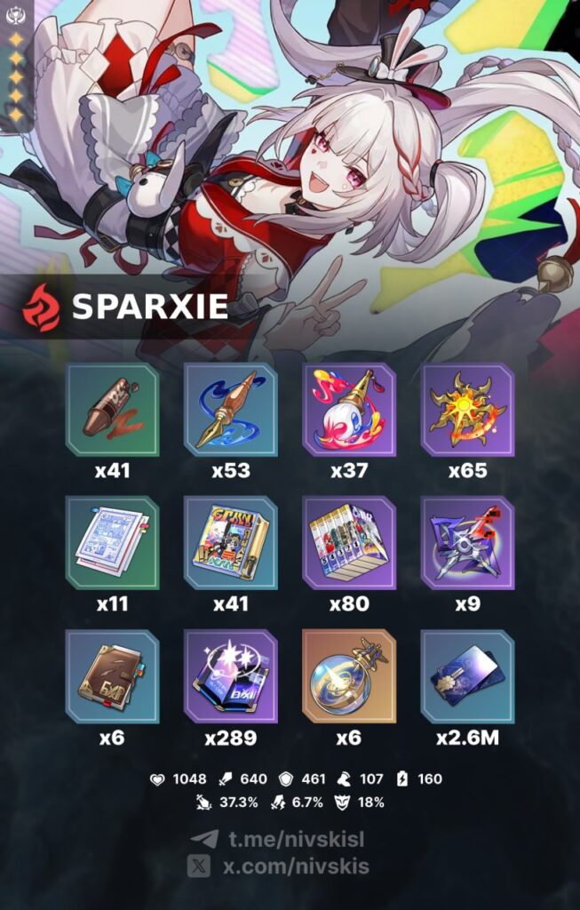 Prioritize strengthening Sparxie’s core damage mechanics (Talent and Skill), then enhance the auxiliary damage output and Punchline Points generation efficiency of her Ultimate.